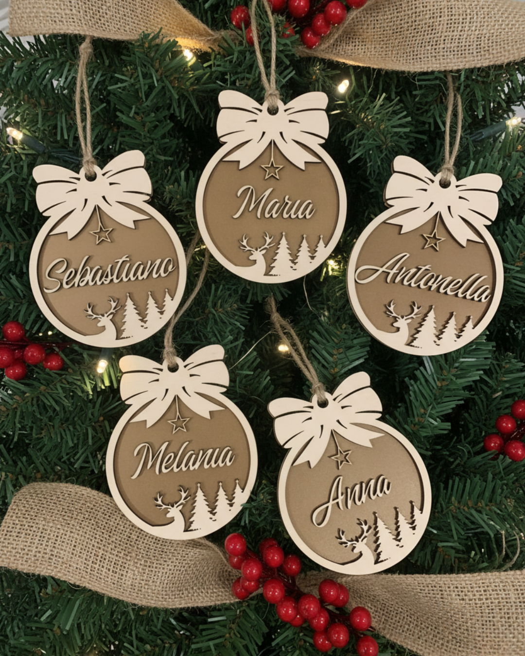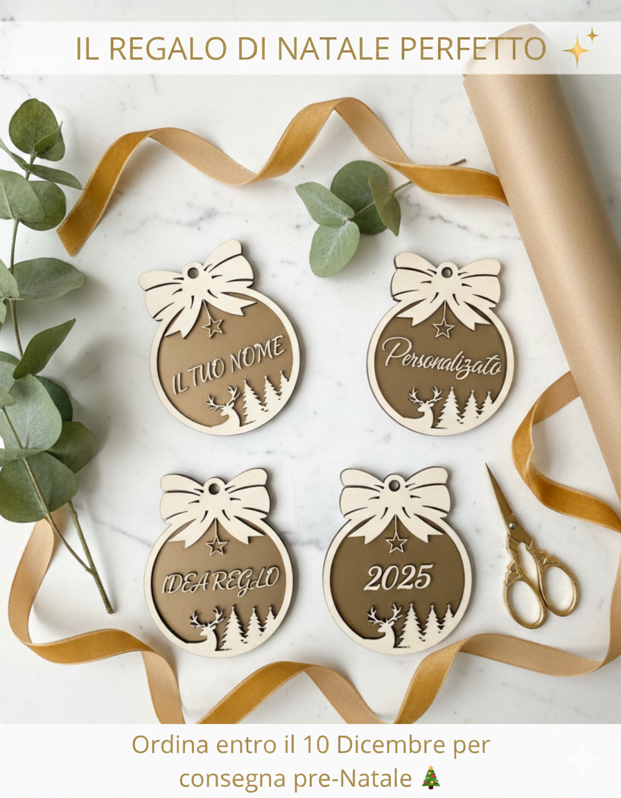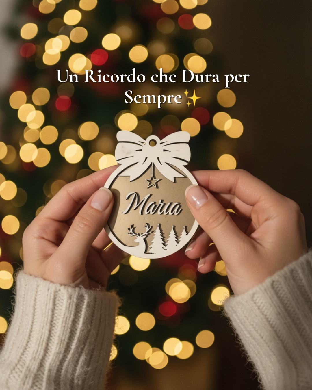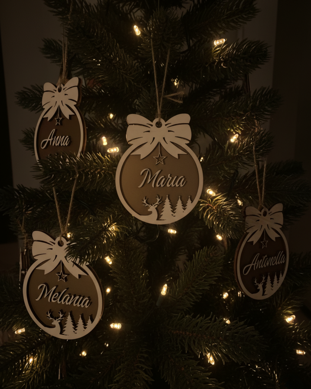 Il design multistrato crea un affascinante effetto 3D: il fiocco in legno sovrapposto alla sfera oro/bronzo genera profondità ed eleganza. La scena invernale incisa (alberi, cervo, stella cometa) incornicia il nome personalizzato, rendendo ogni pezzo unico.