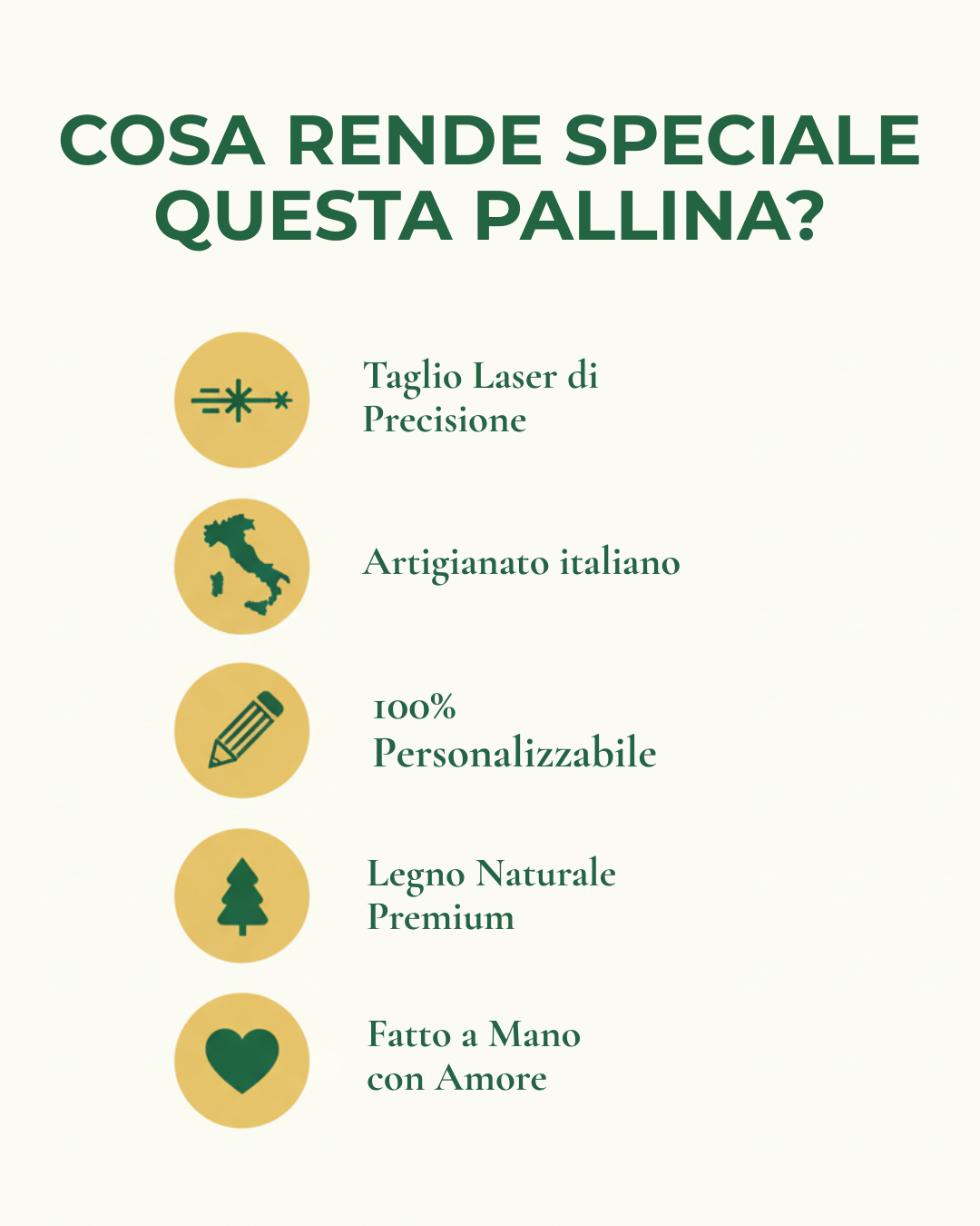 La nostra pallina di Natale personalizzata con nome nasce da un’idea semplice: creare un ricordo che duri per sempre. Realizzata con tecnologia di taglio laser su legno naturale, unisce tradizione artigianale e innovazione.
